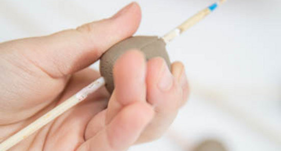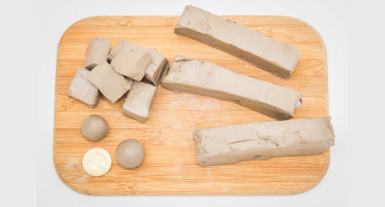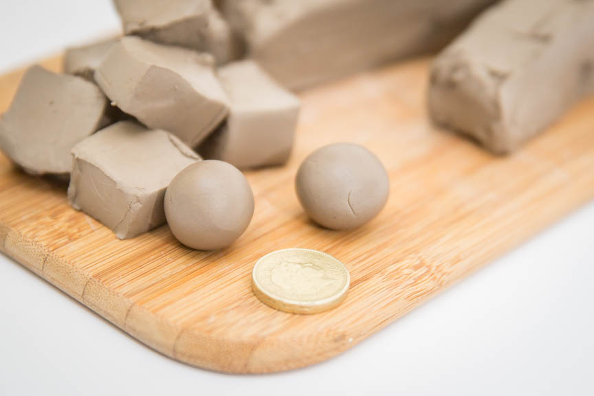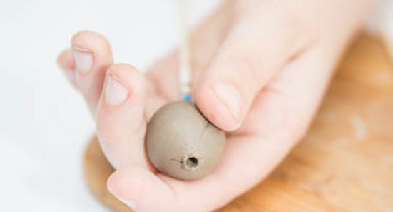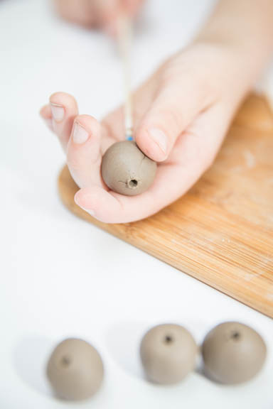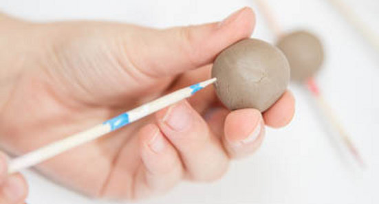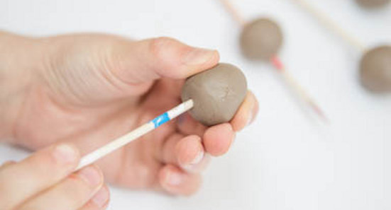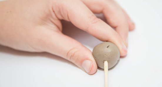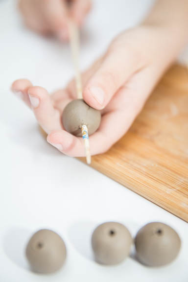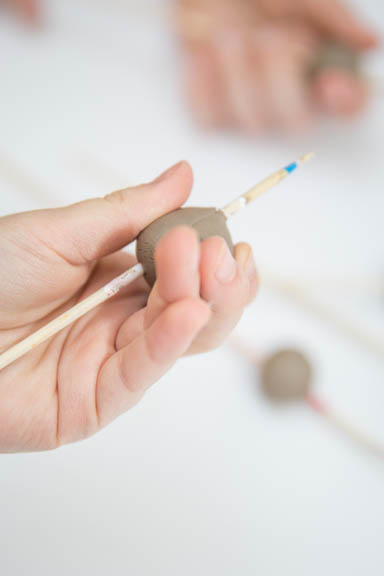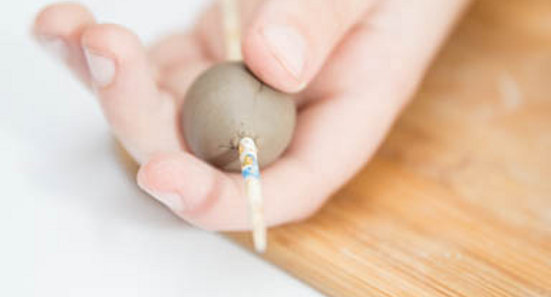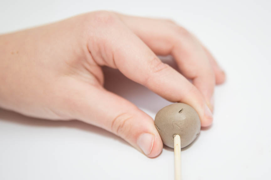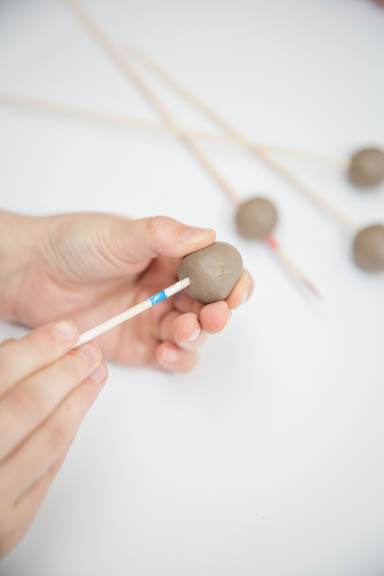 - Roll each cube of clay into balls then pierce with a wooden kebab skewer.